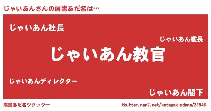 | 男性向けラノベタイトル風あだ名 | 『魔弾の王とじゃいあん』 |