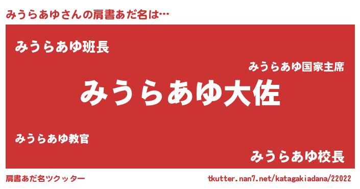 | 男性向けラノベタイトル風あだ名 | 『みうらあゆ~年齢イコール彼女いない歴の魔法使い~』 |