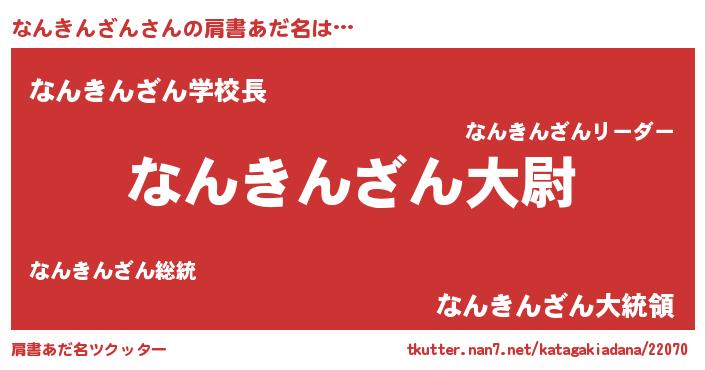 | 男性向けラノベタイトル風あだ名 | 『なんきんざん~年齢イコール彼女いない歴の魔法使い~』 |