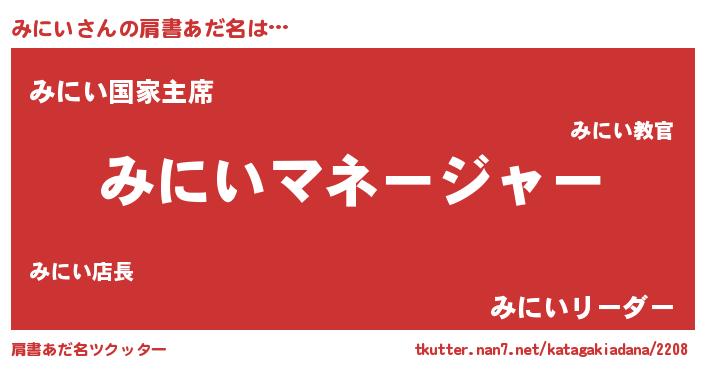 | 男性向けラノベタイトル風あだ名 | 『はたらくみにいさま!』『みにいの憂鬱』 |