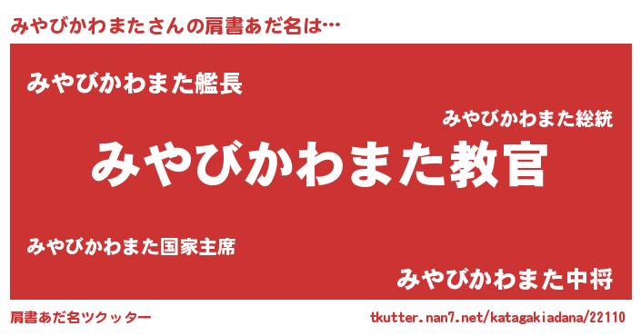 | 男性向けラノベタイトル風あだ名 | 『この素晴らしい世界にみやびかわまたを!』 |