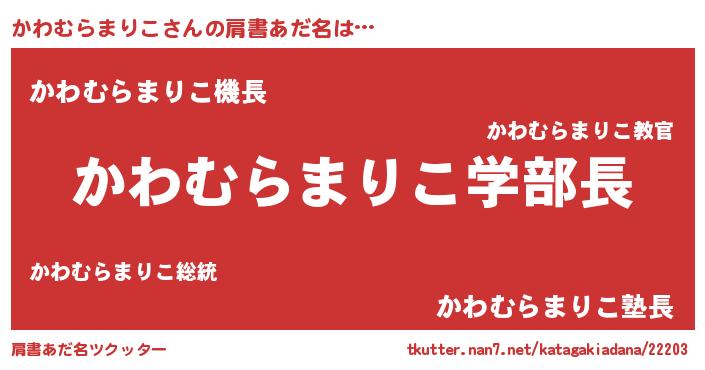 | 男性向けラノベタイトル風あだ名 | 『おまえをオタクにしてやるから、俺をかわむらまりこにしてくれ! 』 |
