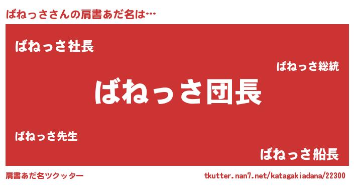 | 男性向けラノベタイトル風あだ名 | 『ばねっさの嫁は女の子じゃないと思った?』 |