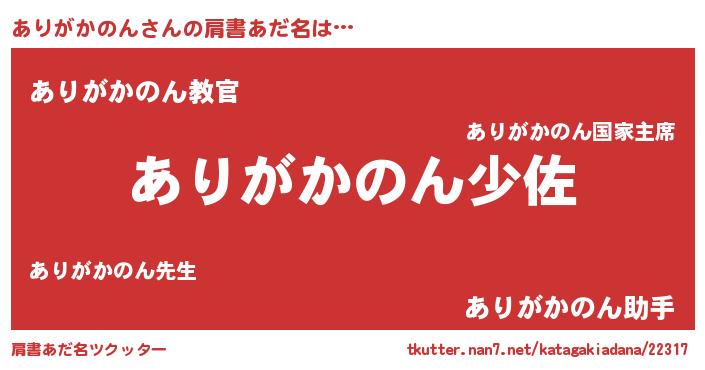 | 男性向けラノベタイトル風あだ名 | 『ありがかのん~年齢イコール彼女いない歴の魔法使い~』 |