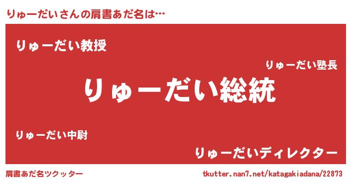 | 男性向けラノベタイトル風あだ名 | 『Re:りゅーだいから始める異世界生活』 |