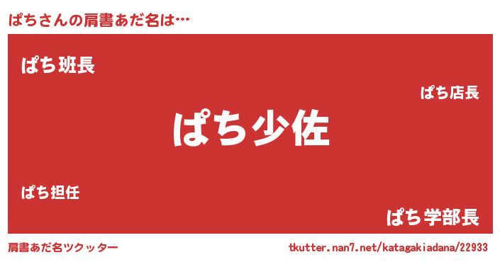 | 男性向けラノベタイトル風あだ名 | 『ぱち~年齢イコール彼女いない歴の魔法使い~』 |