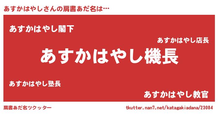 | 男性向けラノベタイトル風あだ名 | 『うちのあすかはやしが世界を掌握している!』 |