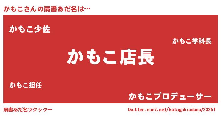 | 男性向けラノベタイトル風あだ名 | 『かもこの憂鬱』『カモコスレイヤー』 |