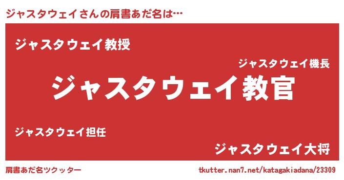 | 男性向けラノベタイトル風あだ名 | 『この素晴らしい世界にジャスタウェイを!』 |