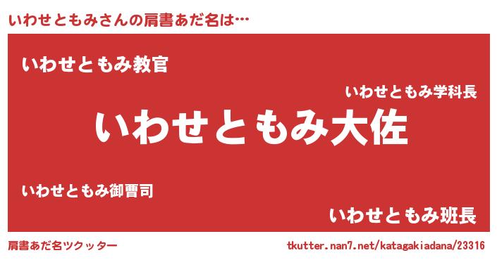 | 男性向けラノベタイトル風あだ名 | 『いわせともみ~年齢イコール彼女いない歴の魔法使い~』 |