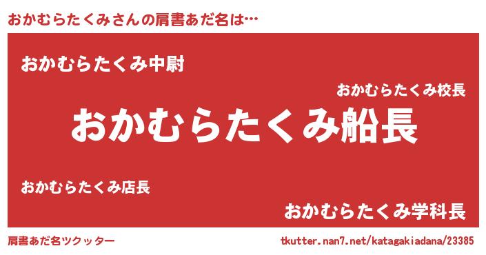 | 男性向けラノベタイトル風あだ名 | 『うちのおかむらたくみが世界を掌握している!』 |
