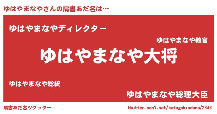 | 男性向けラノベタイトル風あだ名 | 『ゆはやまなや~年齢イコール彼女いない歴の魔法使い~』 |