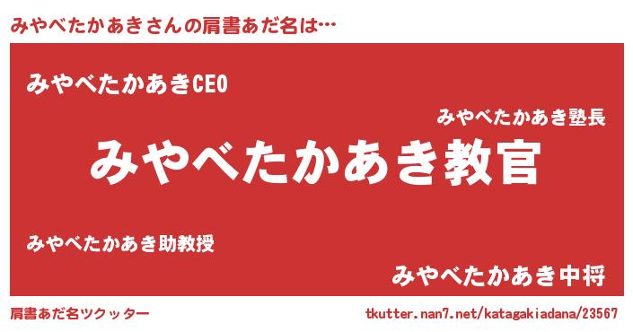| 男性向けラノベタイトル風あだ名 | 『この素晴らしい世界にみやべたかあきを!』 |