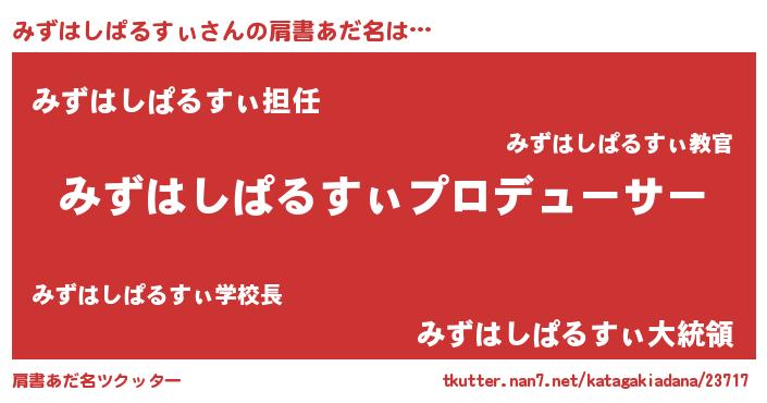 | 男性向けラノベタイトル風あだ名 | 『みずはしぱるすぃに滅ぼされるだけの簡単なお仕事です』 |