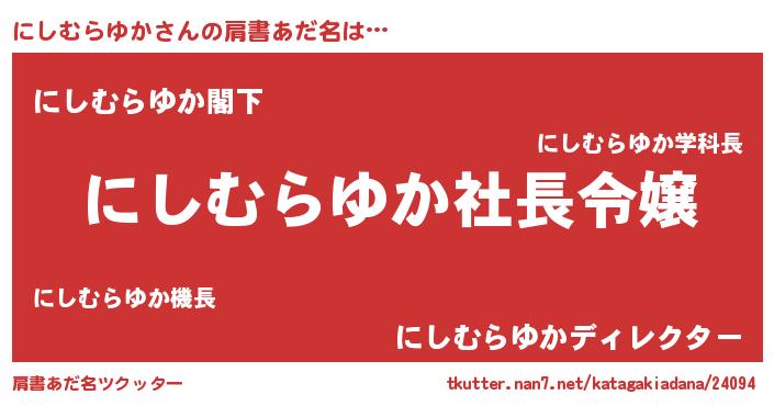 | 女子向けラノベタイトル風あだ名 | 『(仮)にしむらゆかのやんごとなき事情』 |