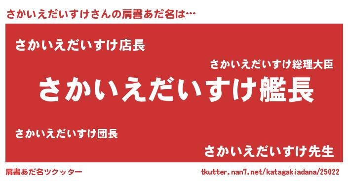 | 男性向けラノベタイトル風あだ名 | 『うちのさかいえだいすけが世界を掌握している!』 |