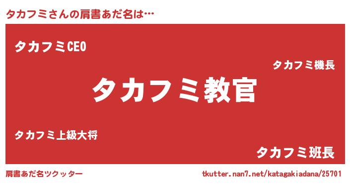 | 男性向けラノベタイトル風あだ名 | 『この素晴らしい世界にタカフミを!』 |