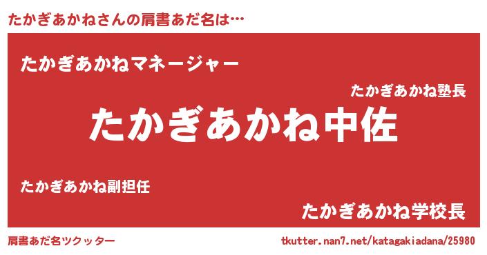 | 男性向けラノベタイトル風あだ名 | 『たかぎあかね~年齢イコール彼女いない歴の魔法使い~』 |