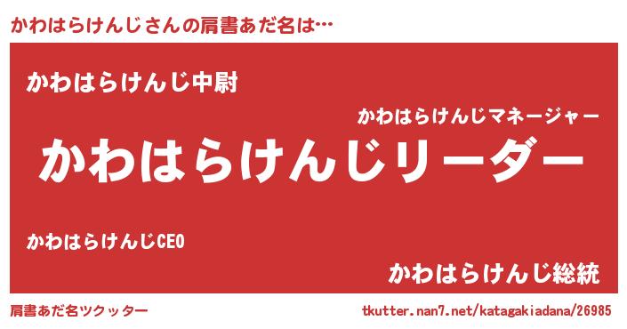 | 男性向けラノベタイトル風あだ名 | 『かわはらけんじの嫁は女の子じゃないと思った?』 |