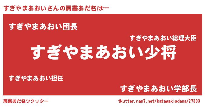 | 男性向けラノベタイトル風あだ名 | 『すぎやまあおい~年齢イコール彼女いない歴の魔法使い~』 |