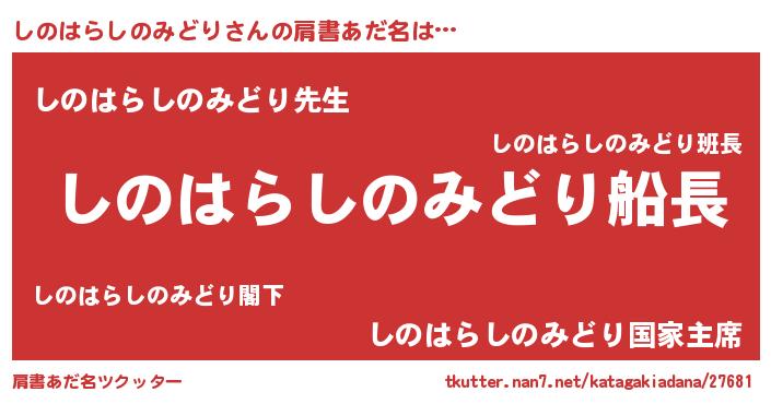 | 男性向けラノベタイトル風あだ名 | 『うちのしのはらしのみどりが世界を掌握している!』 |