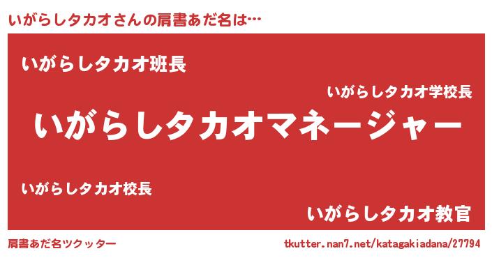 | 男性向けラノベタイトル風あだ名 | 『いがらしタカオに滅ぼされるだけの簡単なお仕事です』 |