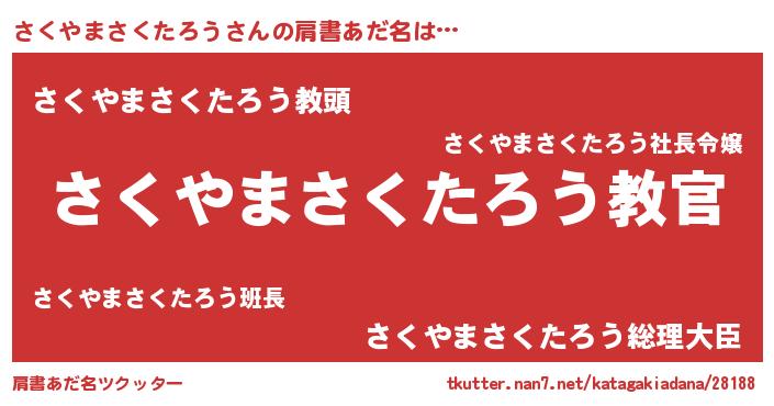 | 男性向けラノベタイトル風あだ名 | 『この素晴らしい世界にさくやまさくたろうを!』 |