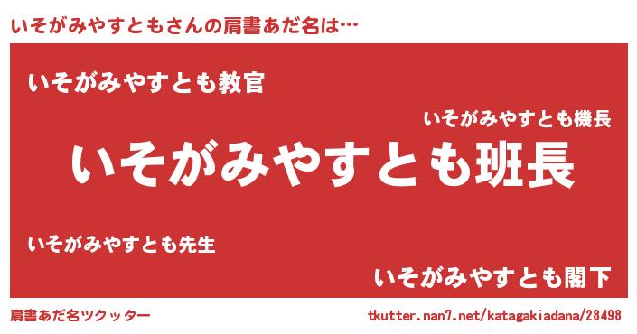 | 男性向けラノベタイトル風あだ名 | 『いそがみやすともの嫁は女の子じゃないと思った?』 |