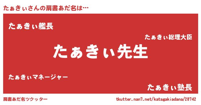 | 男性向けラノベタイトル風あだ名 | 『たぁきぃという概念が存在しない退屈な世界 』 |