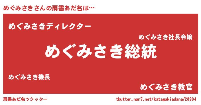 | 男性向けラノベタイトル風あだ名 | 『Re:めぐみさきから始める異世界生活』 |