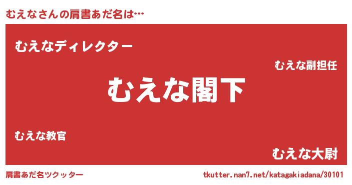 | 意味不明あだ名 | 『自称むえな』『つくし科むえな属』 |