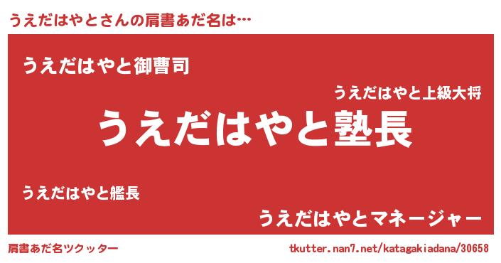 | 男性向けラノベタイトル風あだ名 | 『うえだはやとの嫁は女の子じゃないと思った?』 |