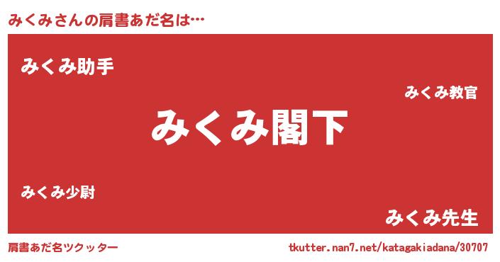 | 男性向けラノベタイトル風あだ名 | 『Re:みくみから始める異世界生活』 |