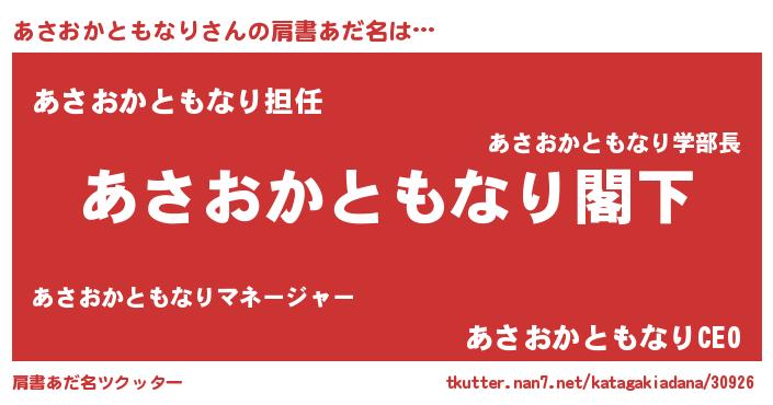 | 女子向けラノベタイトル風あだ名 | 『あさおかともなりなんてお断りですっ。』 |