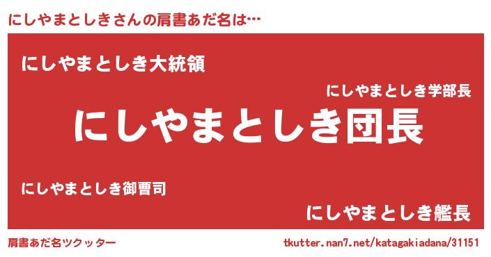 | 男性向けラノベタイトル風あだ名 | 『にしやまとしきの嫁は女の子じゃないと思った?』 |
