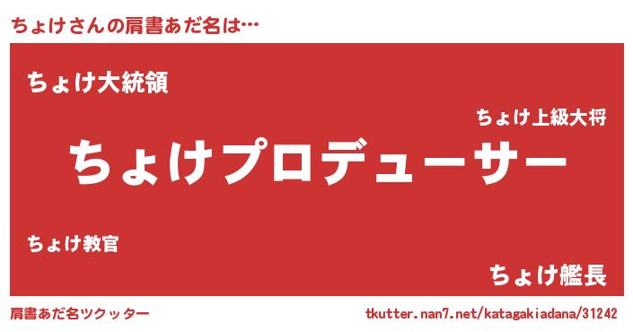 | 男性向けラノベタイトル風あだ名 | 『ちょけに滅ぼされるだけの簡単なお仕事です』 |
