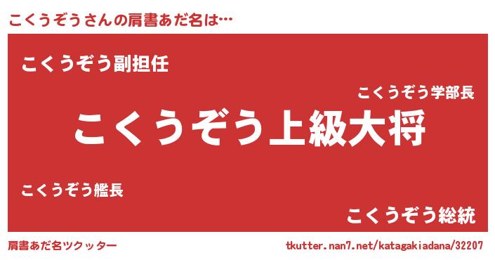 | 男性向けラノベタイトル風あだ名 | 『こくうぞう~年齢イコール彼女いない歴の魔法使い~』 |