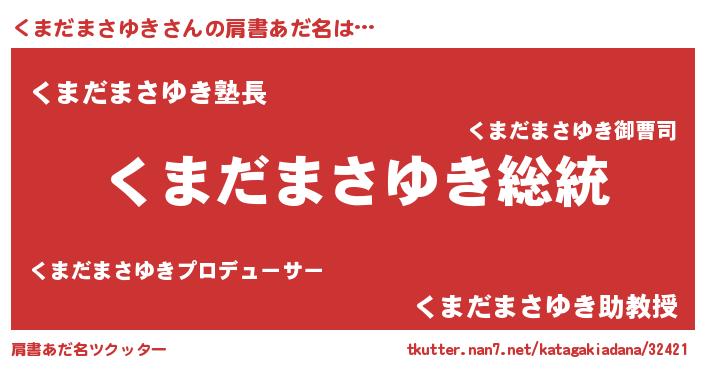 | 男性向けラノベタイトル風あだ名 | 『Re:くまだまさゆきから始める異世界生活』 |