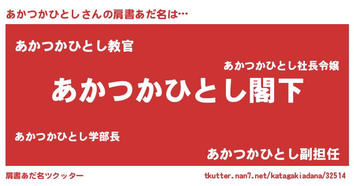 | 男性向けラノベタイトル風あだ名 | 『Re:あかつかひとしから始める異世界生活』 |