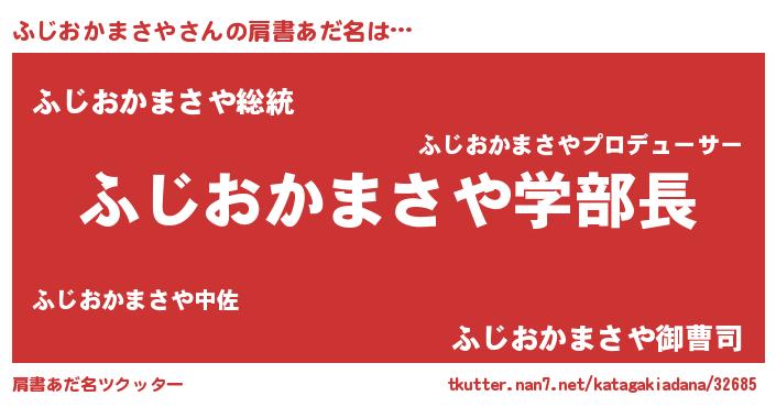 | 男性向けラノベタイトル風あだ名 | 『おまえをオタクにしてやるから、俺をふじおかまさやにしてくれ! 』 |