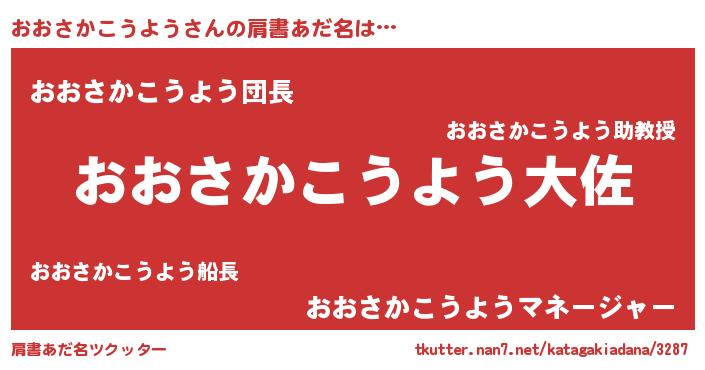 | 男性向けラノベタイトル風あだ名 | 『おおさかこうよう~年齢イコール彼女いない歴の魔法使い~』 |