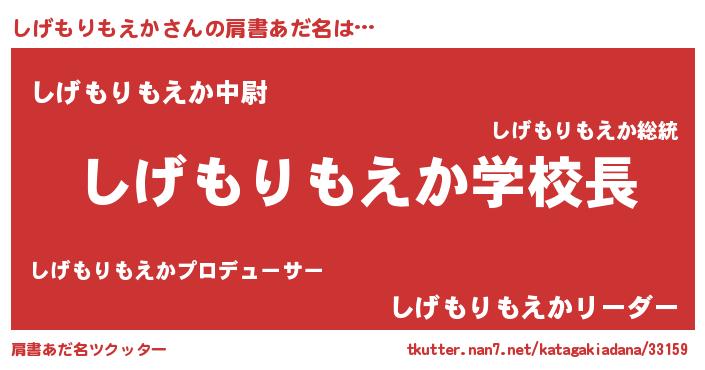 | 男性向けラノベタイトル風あだ名 | 『おまえをオタクにしてやるから、俺をしげもりもえかにしてくれ! 』 |