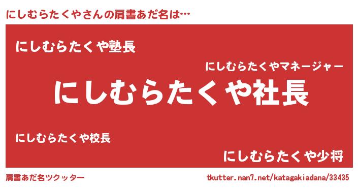 | 男性向けラノベタイトル風あだ名 | 『ニシムラタクヤアートオンライン』 |