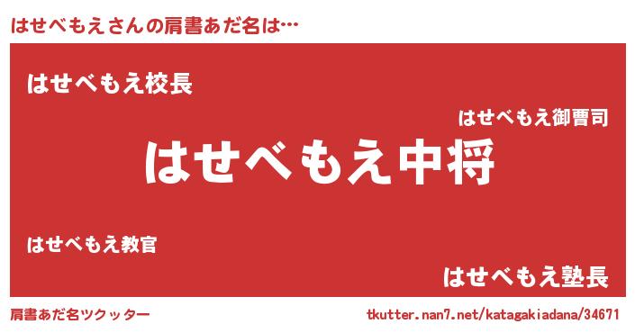 | 男性向けラノベタイトル風あだ名 | 『はせべもえ~年齢イコール彼女いない歴の魔法使い~』 |