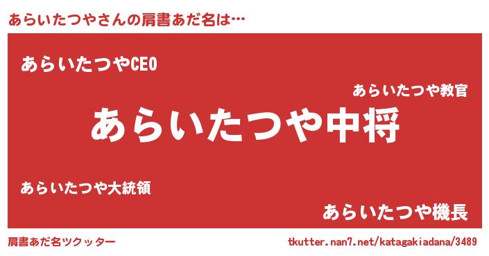 | 男性向けラノベタイトル風あだ名 | 『あらいたつや~年齢イコール彼女いない歴の魔法使い~』 |