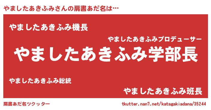 | 男性向けラノベタイトル風あだ名 | 『おまえをオタクにしてやるから、俺をやましたあきふみにしてくれ! 』 |