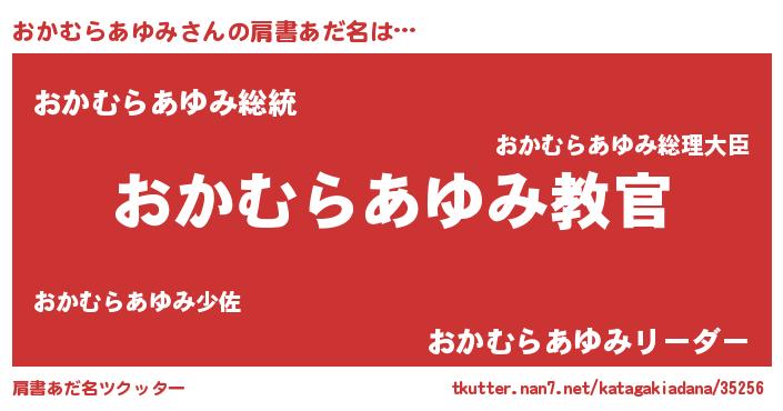 | 男性向けラノベタイトル風あだ名 | 『魔弾の王とおかむらあゆみ』 |