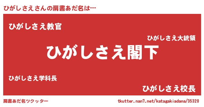 | 男性向けラノベタイトル風あだ名 | 『Re:ひがしさえから始める異世界生活』 |