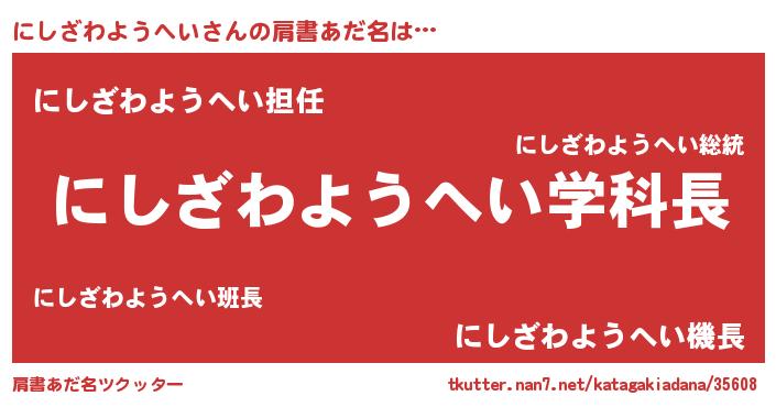 | 男性向けラノベタイトル風あだ名 | 『ノーゲーム・ノーニシザワヨウヘイ』 |