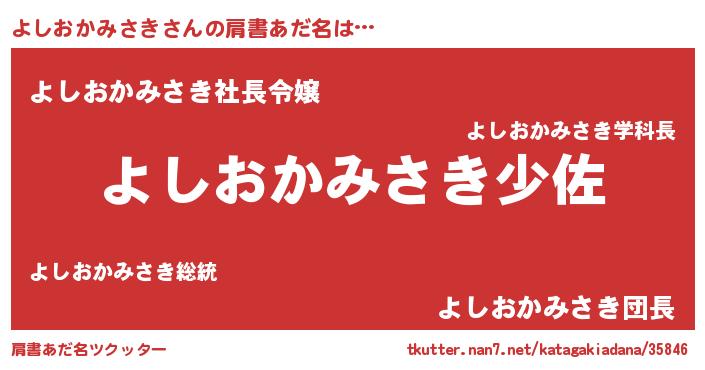 | 男性向けラノベタイトル風あだ名 | 『転生したらよしおかみさきだった件』 |